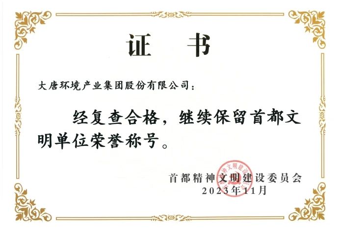 本網(wǎng)訊?近日,首都精神文明建設(shè)委員會頒發(fā)了“首都文明單位”復(fù)查合格證書,大唐環(huán)境產(chǎn)業(yè)集團(tuán)股份有限公司繼2015年獲得“首都文明單位”稱號后,順利通過復(fù)查,連續(xù)保持9年“首都文明單位”稱號。