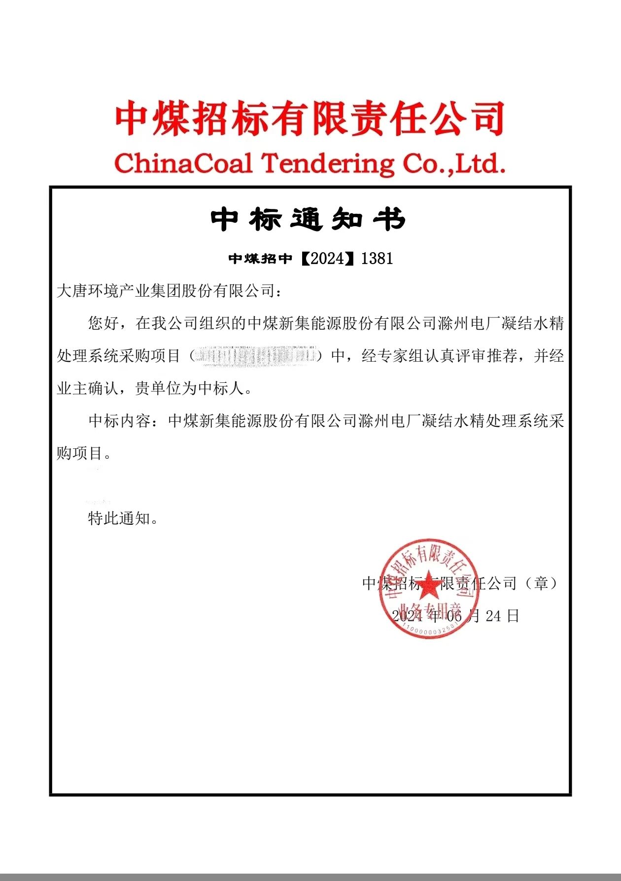 本網(wǎng)訊?近日,水務(wù)公司成功中標(biāo)中煤滁州電廠凝結(jié)水精處理項目。