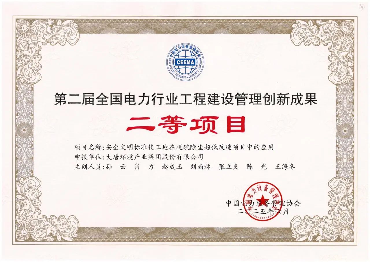 本網(wǎng)訊?近日,中國電力設(shè)備管理協(xié)會公布第二屆全國電力行業(yè)工程建設(shè)管理創(chuàng)新成果評選結(jié)果。大唐環(huán)境環(huán)保分公司雞西項目部申報的《安全文明標準化工地在脫硫除塵超低改造項目中的應(yīng)用》項目,憑借其在安全管理實踐中的顯著成效,獲二等項目獎項。