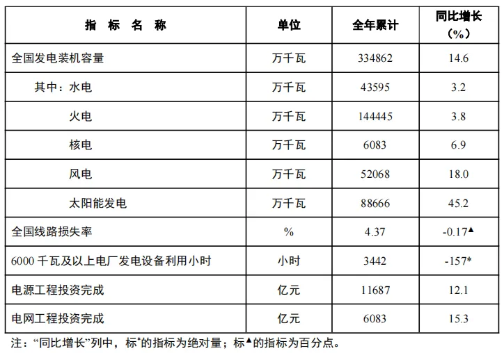 截至12月底,全國累計發(fā)電裝機容量約33.5億千瓦,同比增長14.6%。其中,太陽能發(fā)電裝機容量約8.9億千瓦,同比增長45.2%;風(fēng)電裝機容量約5.2億千瓦,同比增長18.0%。