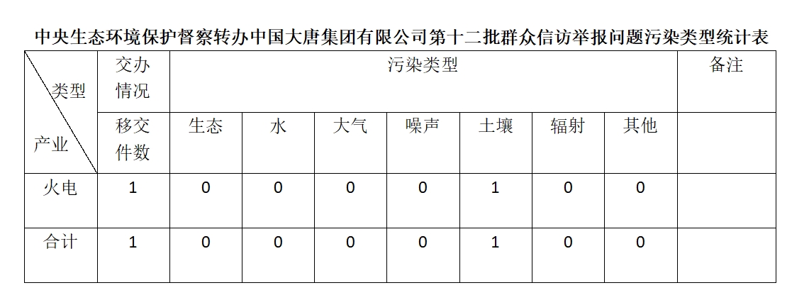 2025年6月16日,中央第七生態(tài)環(huán)境保護督察組向中國大唐集團有限公司移交第十二批群眾信訪舉報件,共計1件,為來信舉報,涉及土壤問題1個。所有舉報件辦理工作已第一時間進入調(diào)查核實辦理程序,辦理情況將按照相關(guān)要求反饋督察組,并及時向社會公開。
