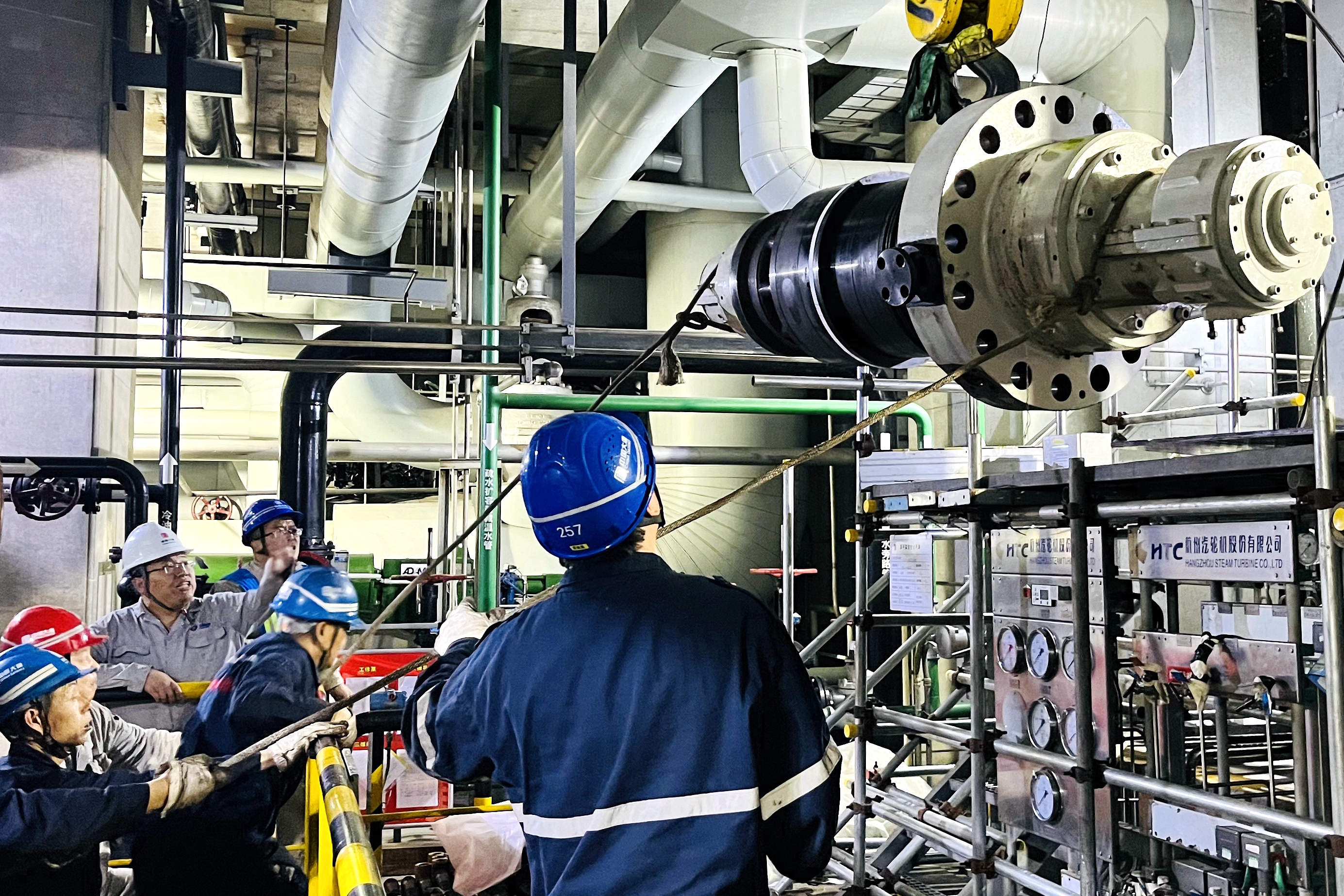 下午3點(diǎn),2號(hào)機(jī)零米給水泵處,日光順著層間通道的高窗斜切進(jìn)來。“起鉤——慢著,左擺半寸!”秦嶺發(fā)電公司承攬富平熱電維檢工作的項(xiàng)目部汽機(jī)專工李強(qiáng)攥著對講機(jī)的指節(jié)泛白,安全帽檐下的眼睛緊盯著半懸的給水泵芯包。起重工武強(qiáng)握著吊機(jī)操作桿,指腹貼在按鈕上緩著勁:“收到,擺幅控制住了?!边@龐然大物裹著剛檢修完的金屬冷光,已吊至泵體上方,正等著“登堂入室”嚴(yán)絲無縫嵌進(jìn)泵體里。