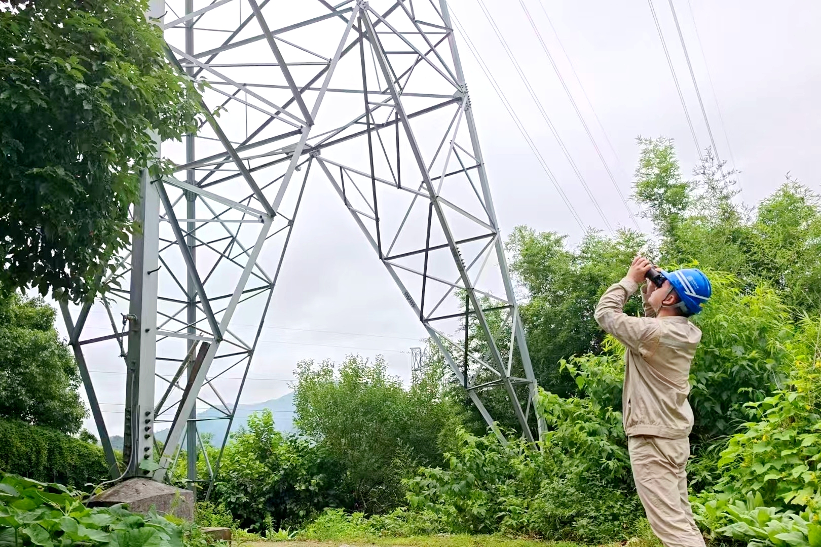 剛剛下過幾天小雨,山里的路還有些泥濘。每個(gè)人背著20多斤重的避雷器和備件,一步一個(gè)腳印走在山道上。晨露順著褲管往上爬,混雜著枯葉和泥水,打濕了每個(gè)人的褲腿。