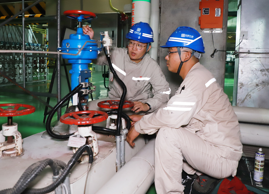 “為什么沒看到冷卻塔呢?這可是火力發(fā)電廠的標志啊?!甭犃死蠋煾档闹v解我才知道,原來那一排如“哨兵”般佇立于廠區(qū)南側,常年“云霧繚繞”的便是區(qū)別于大部分火電廠“自然通風冷卻塔”的“機力通風冷卻塔”。值得一提的是,我們公司創(chuàng)新使用了“一機雙塔”節(jié)能降耗技術:通過將兩臺機力通風冷卻塔的回水管道連通,當單臺機組運行時,可以將循環(huán)水噴入到另一臺機力塔中增大冷卻面積,夏季可提高機組真空1.53 kPa,年節(jié)能量4802噸標準煤。
