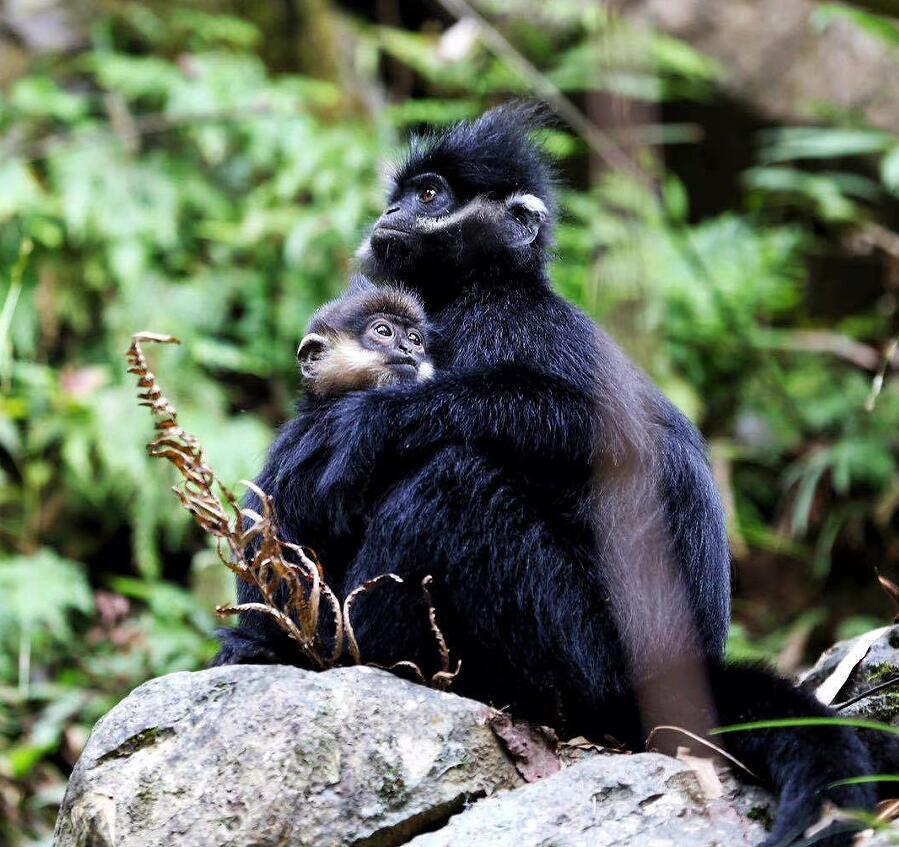 經(jīng)過(guò)長(zhǎng)途奔波,快艇行駛到貴州省沿河縣境內(nèi)的“麻陽(yáng)河國(guó)家級(jí)自然保護(hù)區(qū)”。山上傳來(lái)各種表達(dá)不同“情緒”的叫聲,在生態(tài)環(huán)保專(zhuān)業(yè)崗位奮斗8年之久的饒振祺朝密林中一指:“快看,那就是黑葉猴!發(fā)出‘嘎,嘎’的叫聲,說(shuō)明它們處在愉快的覓食狀態(tài)中;‘噢、噢’就是它們?cè)谏搅珠g攀援前進(jìn)的信號(hào)?!碧а弁ィ瑤r石間、樹(shù)蔭深處不斷有黑葉猴迅捷地跳躍。它們頭頂冠毛蓬松,通體黑色,兩頰雪白的“絡(luò)腮胡”格外醒目,看起來(lái)像銀須飄飄的“小老頭”。有的黑葉猴懷里還抱著“金寶寶”——幼猴毛色金黃,隨年齡增大變黑。