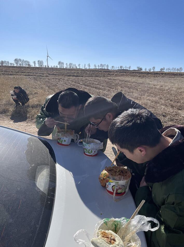在風(fēng)場(chǎng)值班時(shí),一日三餐只能是泡面、自熱米飯這類速食品。為方便下班的同事吃飯、保證飲食安全,大家在住宿賓館附近選擇一家小餐館,作為值班回來就餐的“定點(diǎn)食堂”。接上完成交接班的同事們,我們一起去體驗(yàn)了“食堂”。晚餐過程中,大家說說笑笑,精神狀態(tài)很不錯(cuò),完全看不出已經(jīng)在風(fēng)場(chǎng)風(fēng)餐露宿了兩周多時(shí)間。