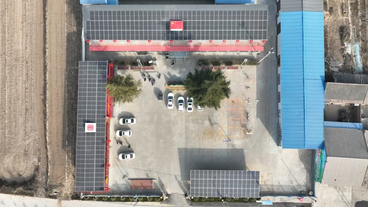 走進和家樓村村部,一排排深藍色的單晶硅組件板在日光的照射下閃閃發(fā)光,格外耀眼。分布式光伏和智能充電樁緩解周邊群眾充電壓力,方便群眾“綠色”出行。光伏板中央將中國紅、大唐紅元素融入項目中,嵌入國旗和唐標,點綴大紅燈籠、中式欄桿等中國風(fēng)傳統(tǒng)風(fēng)格,繪就一幅美麗鄉(xiāng)村新畫卷。